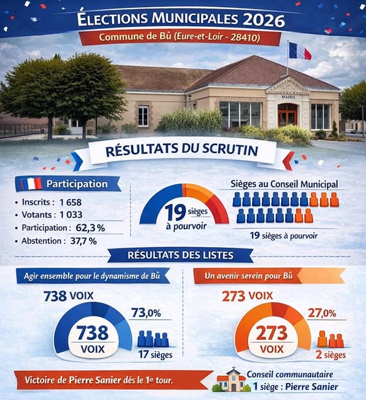 Avec 73% des voix, les habitants de Bû ont choisi de renouveler leur confiance à l’équipe de Pierre SANIER dès le premier tour. Nous continuerons à agir pour les Buxoises et les Buxois, à développer la commune de Bû, à améliorer votre cadre de vie, et préparer l’avenir du village. Encore Merci !