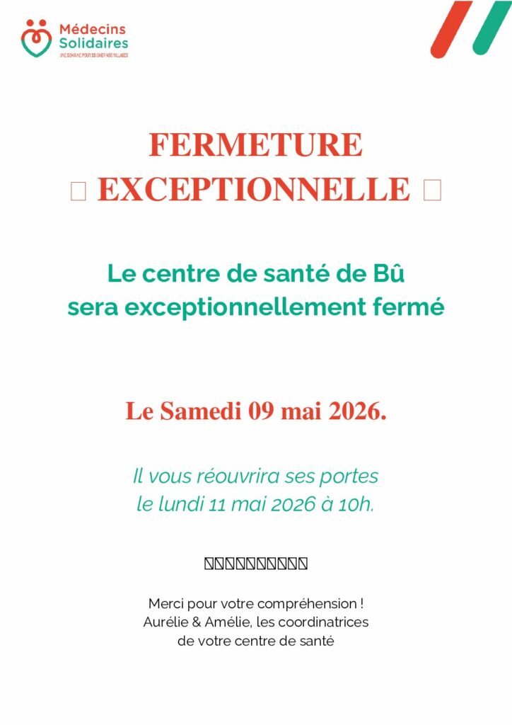 Le centre de santé de Bû sera exceptionnellement fermé le samedi 09 mai 2026